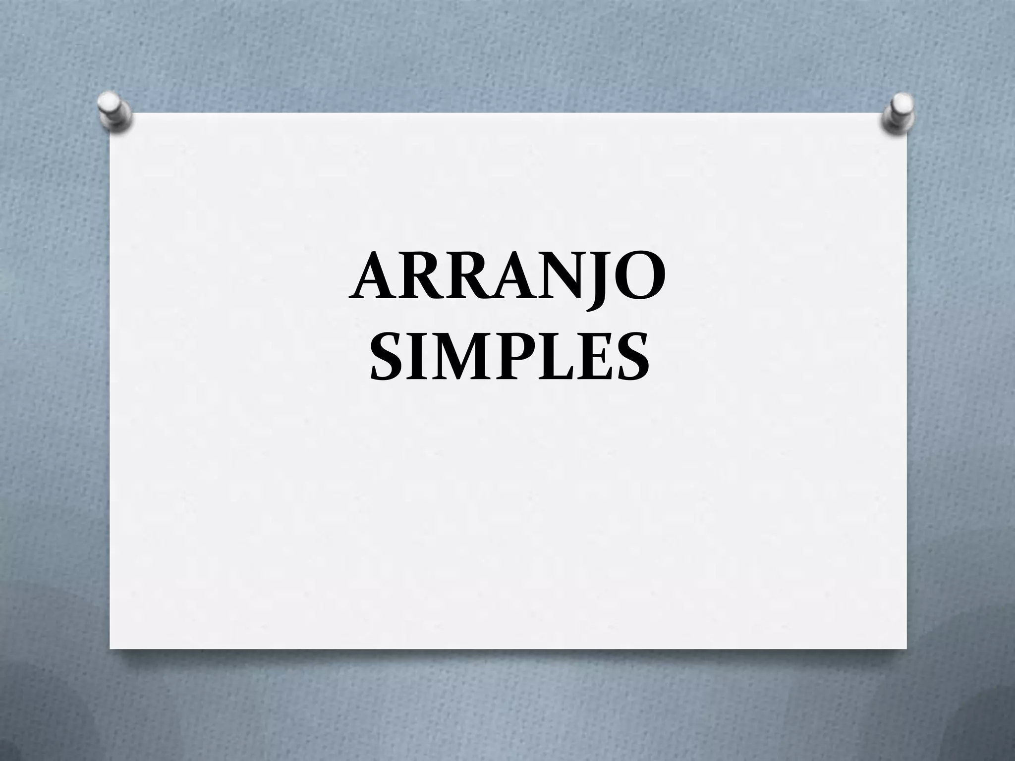 O documento explica o que são arranjos simples, que são agrupamentos onde a ordem dos elementos faz diferença. Ele fornece a fórmula geral para calcular a quantidade de arranjos simples de um conjunto e ilustra com três exemplos de como aplicar a fórmula.