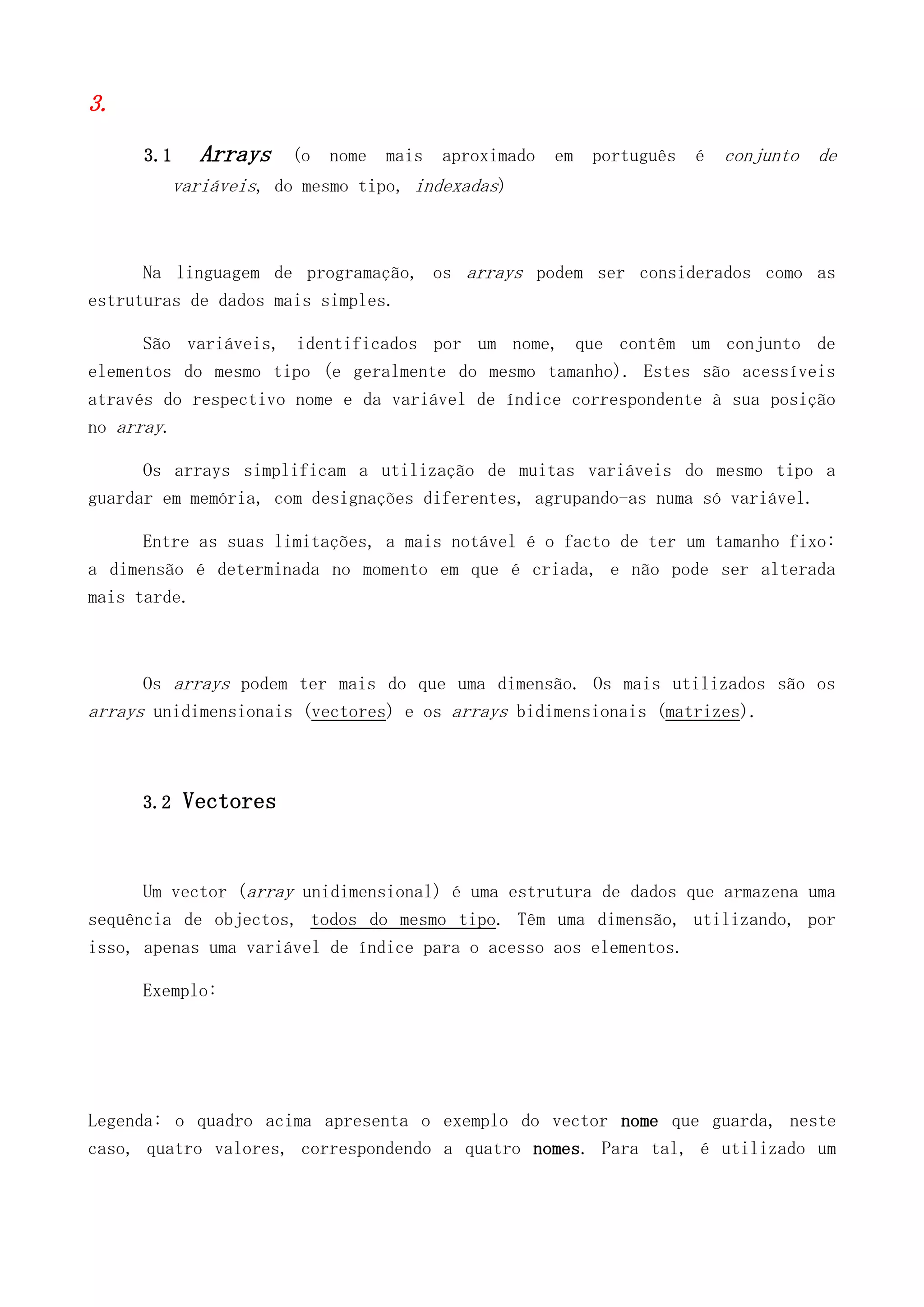 Arrays são estruturas de dados que armazenam um conjunto de elementos do mesmo tipo indexados. Vectores são arrays unidimensionais que armazenam uma sequência de objetos usando uma variável de índice. Algoritmos de ordenação e pesquisa, como inserção, seleção e bolha, são usados para organizar e localizar elementos em arrays/vectores.