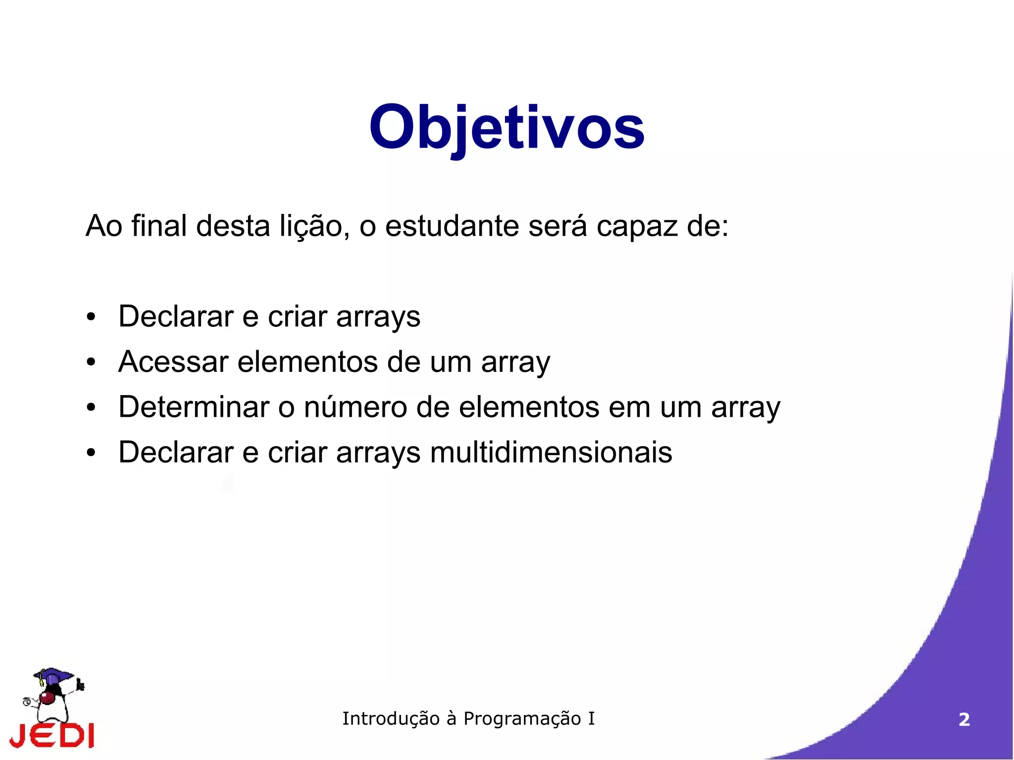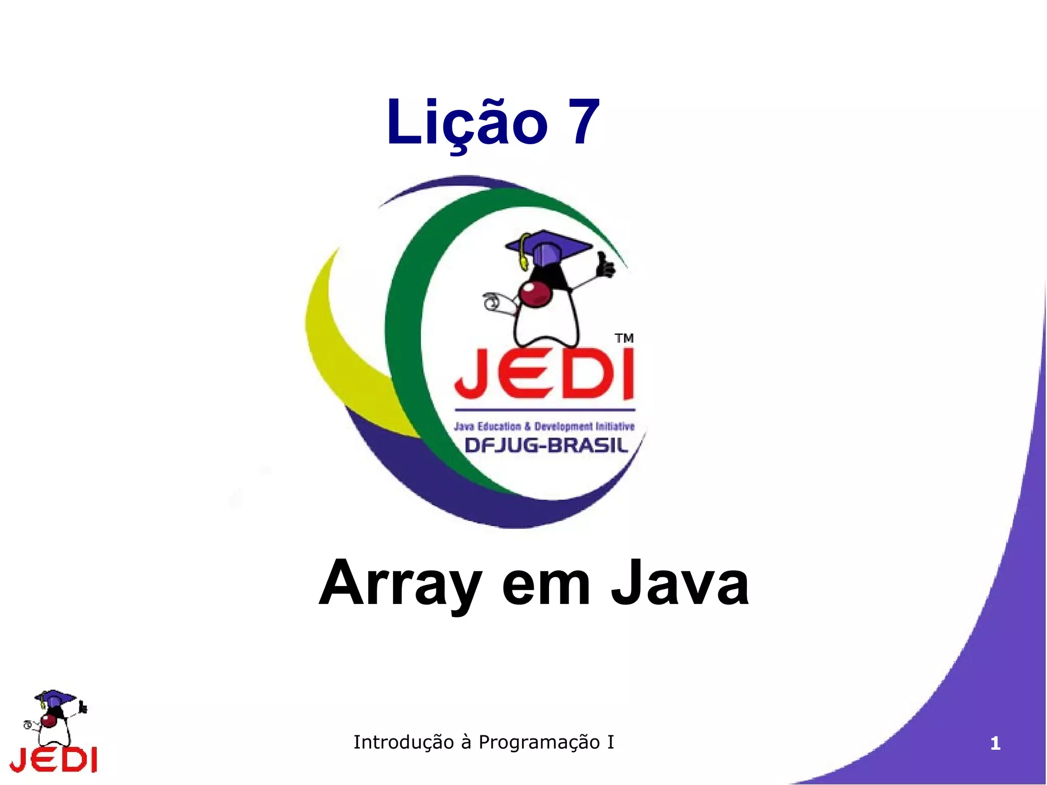 - O documento apresenta uma lição sobre arrays em Java, introduzindo sua definição, declaração, criação, acesso a elementos, uso do atributo length e arrays multidimensionais.