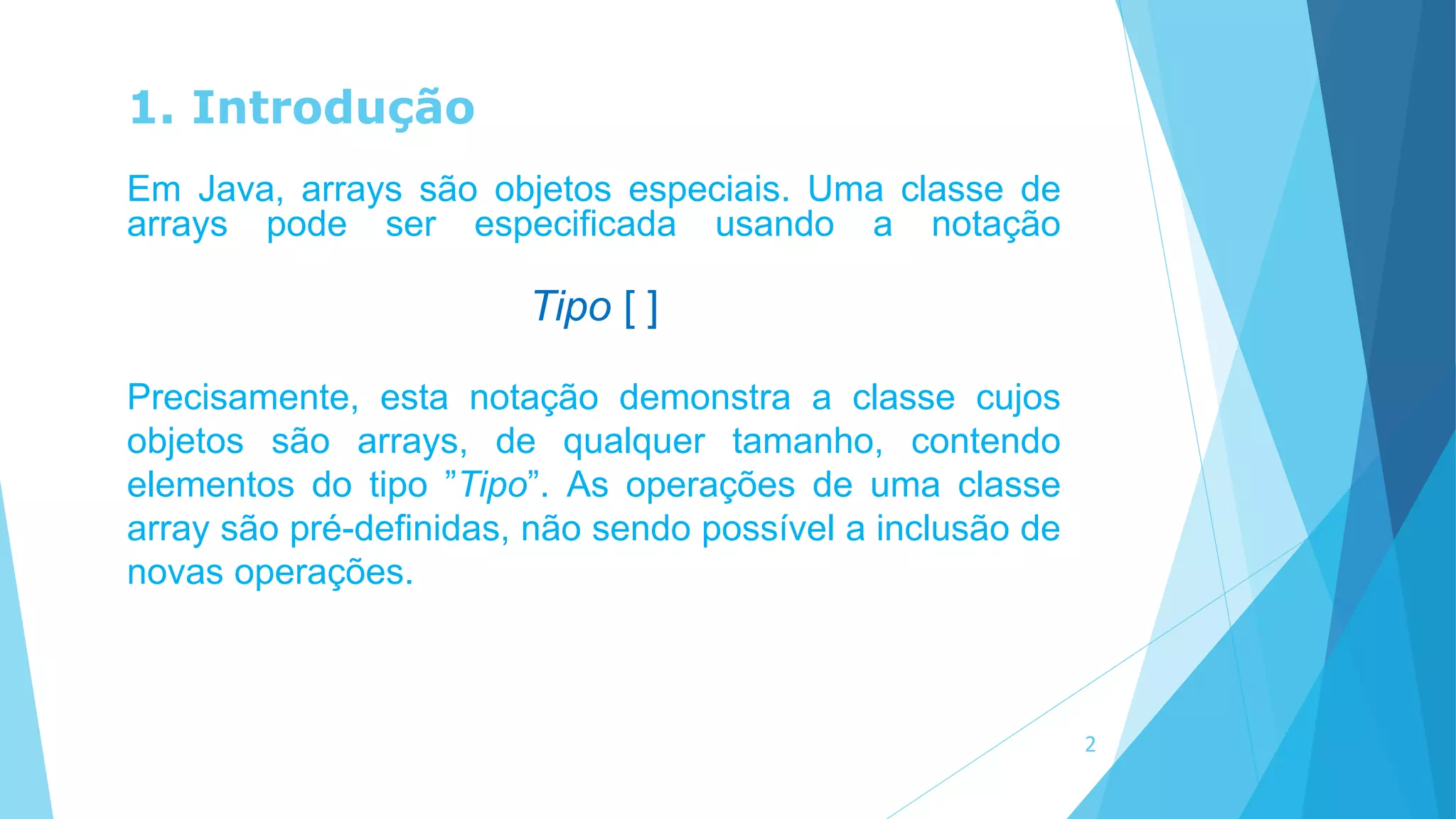 O documento discute arrays em Java, incluindo como criá-los, acessar elementos, percorrê-los e ordená-los. É explicado que arrays são objetos que armazenam múltiplas variáveis do mesmo tipo e que cada elemento tem um índice. Métodos como for, foreach, Arrays.sort(), Arrays.copyOf() e Arrays.fill() são apresentados para manipular arrays.