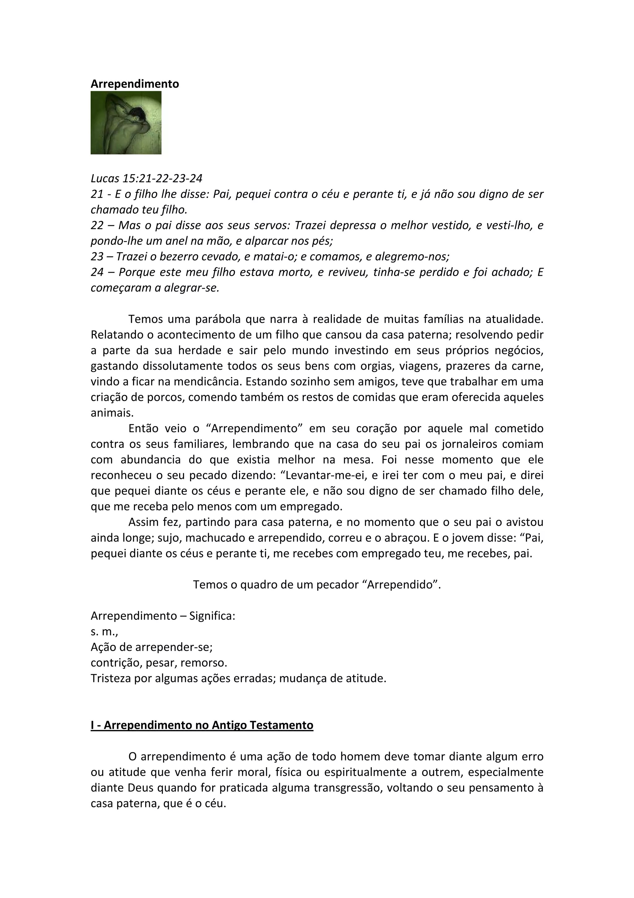 O documento descreve o significado e exemplos bíblicos de arrependimento. I - O arrependimento é ilustrado no Antigo Testamento através do rei Davi e do profeta Jonas. II - No Novo Testamento, João Batista pregava o arrependimento e Jesus ensinou sobre o arrependimento do publicano. Arrependimento significa reconhecer erros e mudar de atitude, buscando misericórdia de Deus.