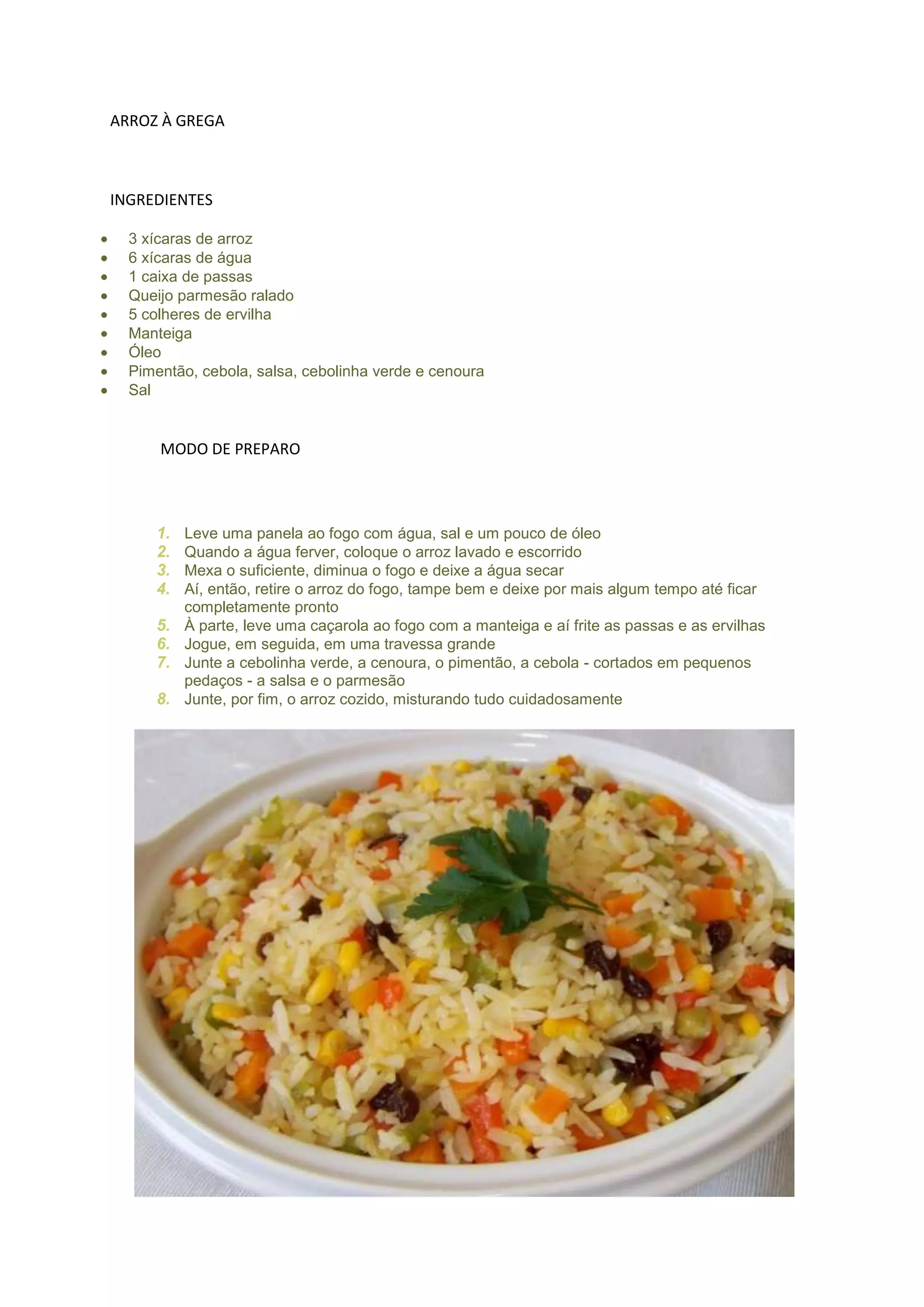 Este documento fornece uma receita para arroz à grega que inclui cozinhar arroz em água com sal e óleo, fritar passas e ervilhas em manteiga, e misturar os ingredientes cozidos com cebola, cenoura, pimentão, salsa, queijo parmesão e cebolinha verde.