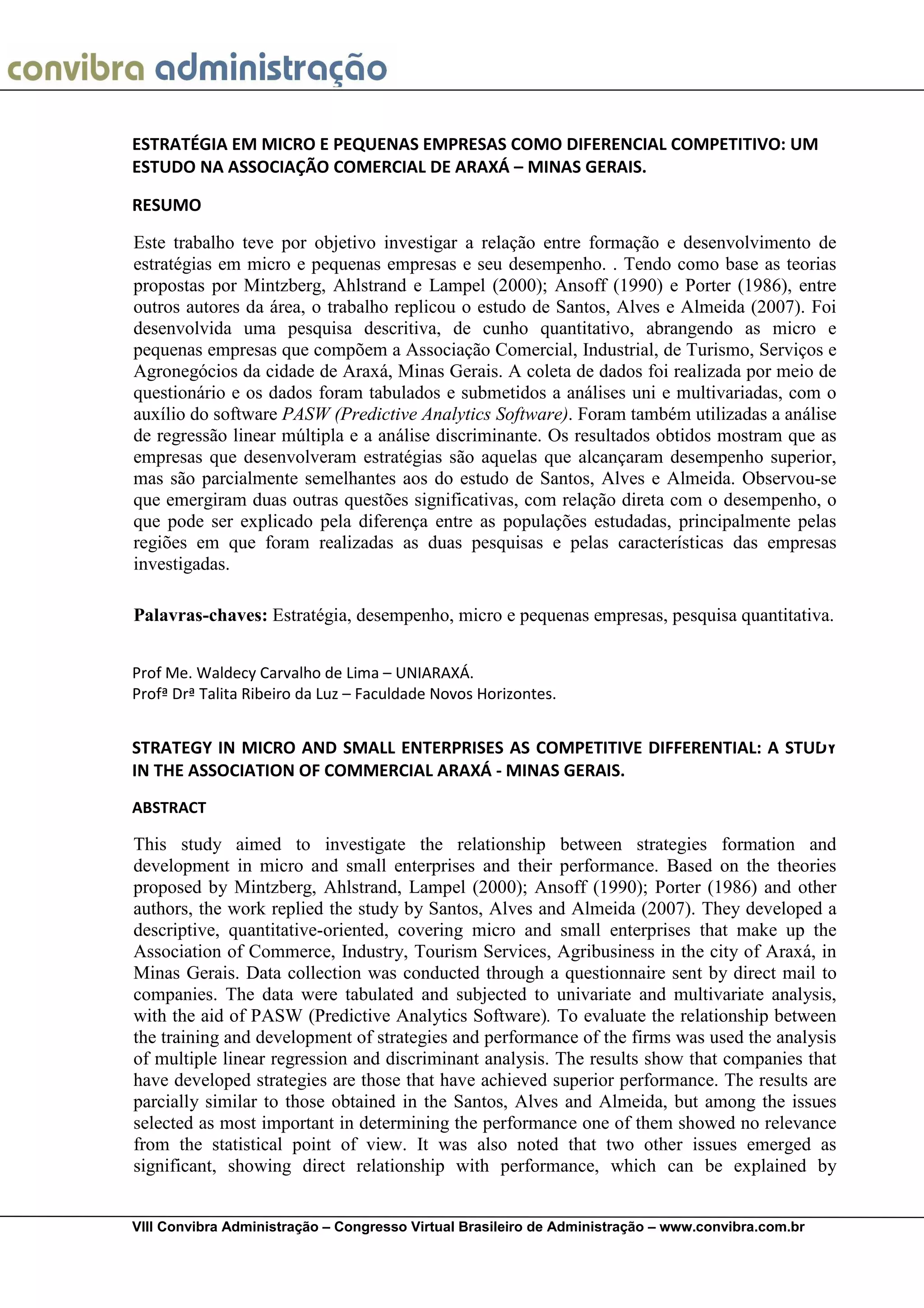 Este documento discute um estudo sobre estratégias em micro e pequenas empresas da Associação Comercial de Araxá-MG e seu efeito no desempenho. O estudo teve como objetivo investigar a relação entre a formação e desenvolvimento de estratégias nessas empresas e seu desempenho, replicando um estudo anterior. Uma pesquisa quantitativa foi realizada com empresas da associação comercial local. Os resultados mostraram que empresas que desenvolveram estratégias tiveram melhor desempenho, mas resultados parcialmente semelhantes