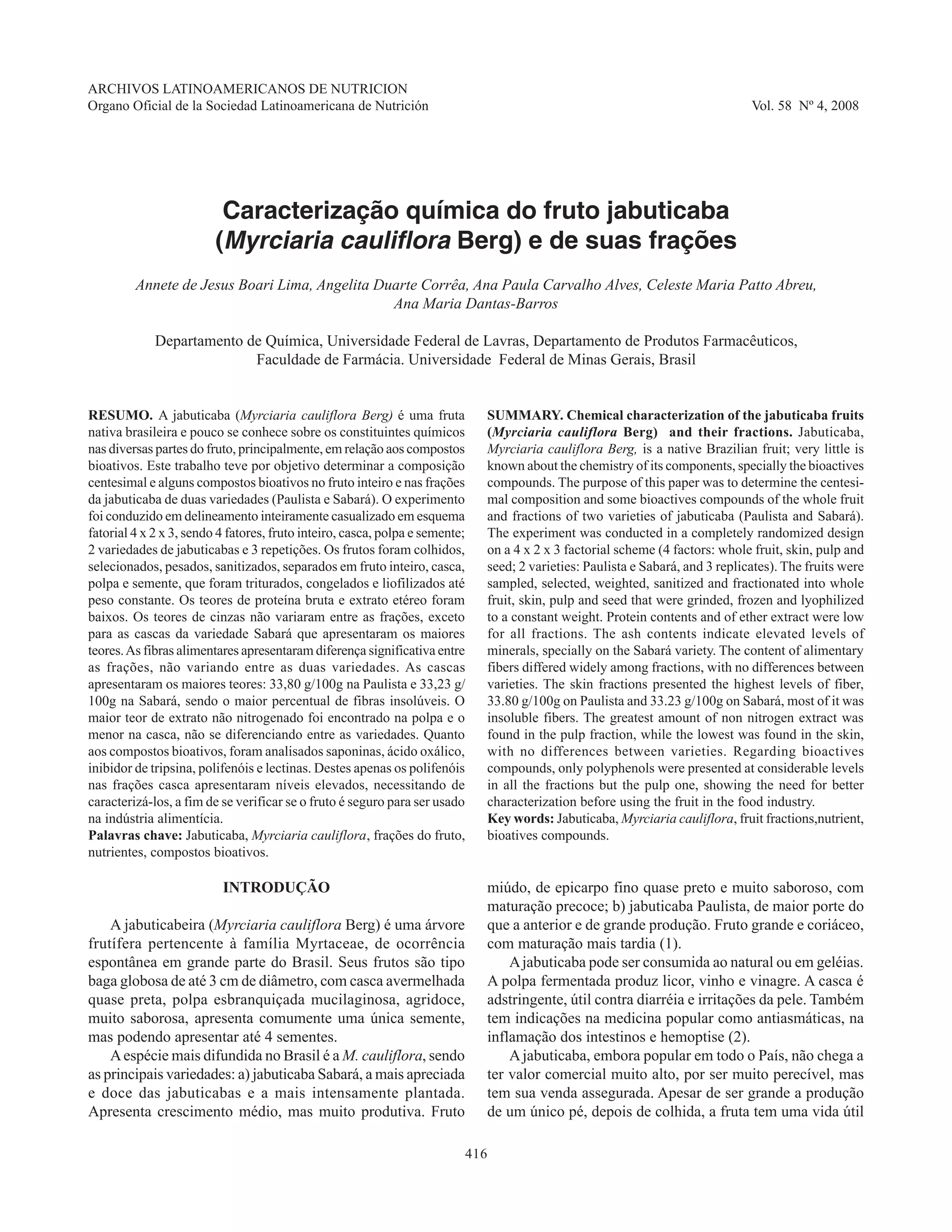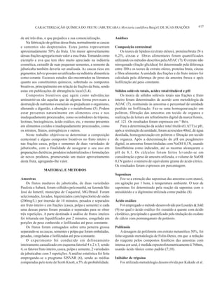 Este documento descreve uma pesquisa sobre a caracterização química do fruto jabuticaba e suas frações. Foram analisados os teores de nutrientes, compostos bioativos e a composição centesimal do fruto inteiro e frações (casca, polpa e semente) de duas variedades de jabuticaba. Os resultados mostraram diferenças significativas nos teores de fibras, compostos fenólicos e minerais entre as frações, com potencial para aproveitamento industrial das cascas e sementes.