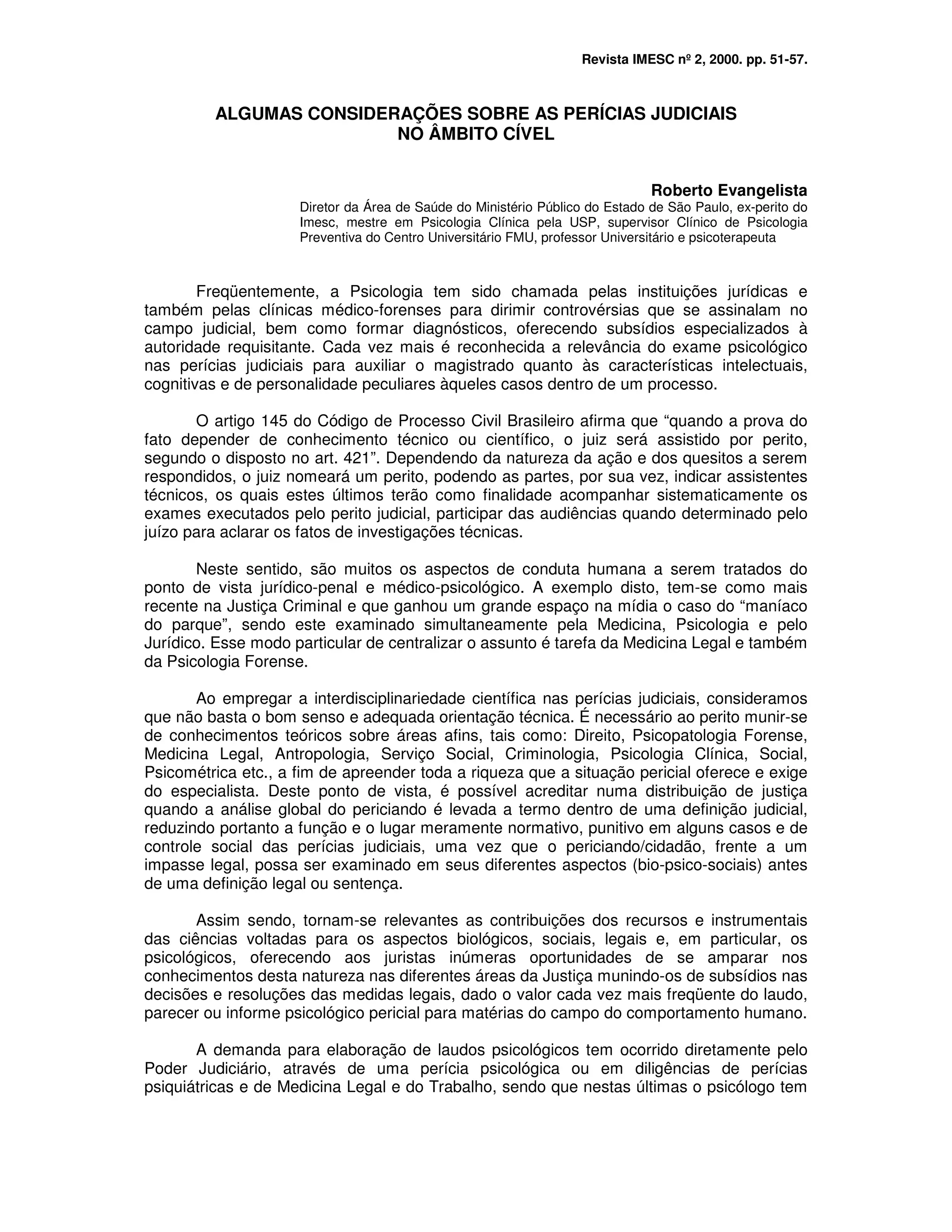 Este documento discute o papel da psicologia nas perícias judiciais no âmbito civil no Brasil. A psicologia é chamada para fornecer diagnósticos e subsídios especializados para auxiliar os magistrados. Nas perícias cíveis, os psicólogos avaliam danos psicológicos e capacidade civil em casos como acidentes e casamentos. O documento também fornece diretrizes para a realização de perícias psicológicas, como a leitura dos autos do processo e a elaboração de laudos.