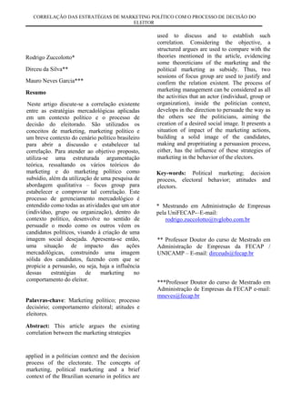 Este documento discute a correlação entre estratégias de marketing político e o processo de decisão do eleitor. Apresenta conceitos de marketing e marketing político, e como estratégias como os 4Ps (produto, preço, distribuição e promoção) são aplicadas no contexto político. Também aborda como pesquisas qualitativas como grupos de foco podem justificar a influência das estratégias de marketing no comportamento eleitoral.