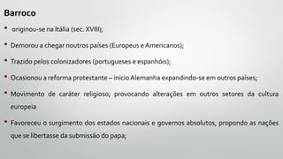 O documento descreve as características principais do Barroco e do Rococó, incluindo sua origem na Itália e disseminação para outros países europeus e americanos, enfatizando emoções em vez de racionalidade. Também apresenta exemplos importantes de pintores como Tintoretto e Caravaggio, escultores como Bernini e Aleijadinho, e estilos arquitetônicos.