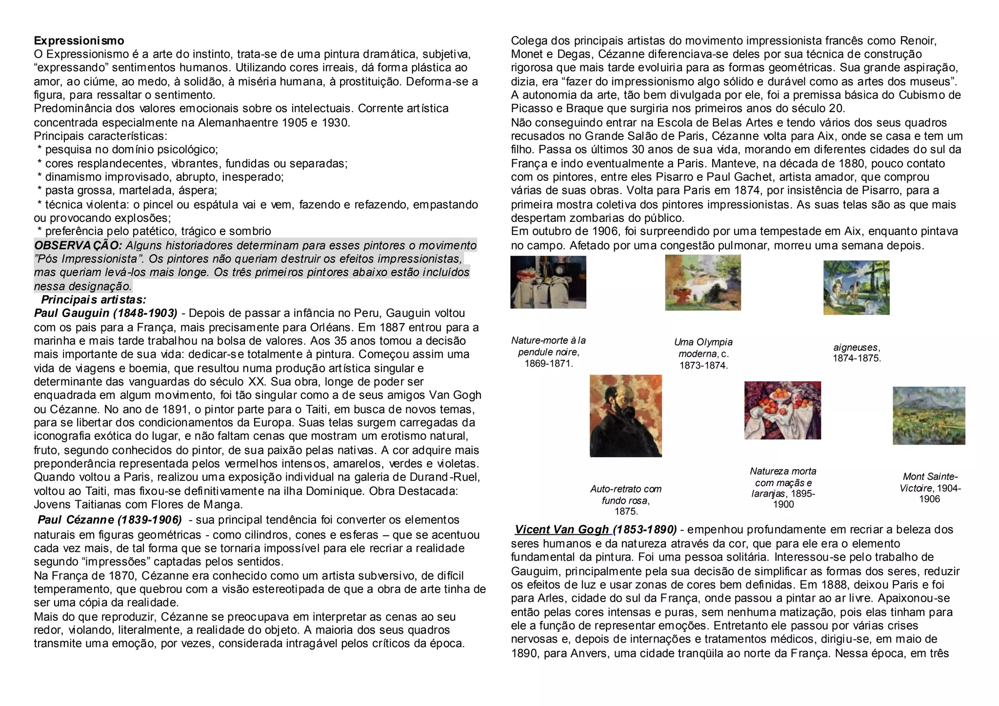 O documento descreve os principais movimentos artísticos pós-impressionistas, incluindo o expressionismo, cubismo e as obras de artistas como Cézanne, Gauguin, Van Gogh, Toulouse-Lautrec e Munch. O documento também discute o movimento expressionista alemão e artistas como Kirchner.