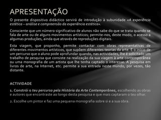 Este documento apresenta uma introdução à análise da experiência estética, permitindo que os alunos tenham acesso a obras de arte através de reproduções digitais. Propõe uma viagem por diferentes movimentos artísticos para contactar com obras representativas. Os alunos são incentivados a aprofundar este percurso através de pesquisas sobre a história da arte contemporânea ou monografias de artistas.