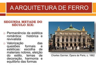 O documento descreve a arquitetura de ferro na segunda metade do século XIX e a arte nova entre 1890 e 1914. A arquitetura de ferro permitiu a construção de grandes estruturas leves com ferro e vidro. Os engenheiros aplicaram novos materiais e técnicas de forma funcional. A arte nova foi um movimento artístico modernista que rompeu com a tradição, inspirado pela natureza, artes decorativas e pintura japonesa. Desenvolveu-se principalmente na Bélgica e Catalunha com ênfase na dec