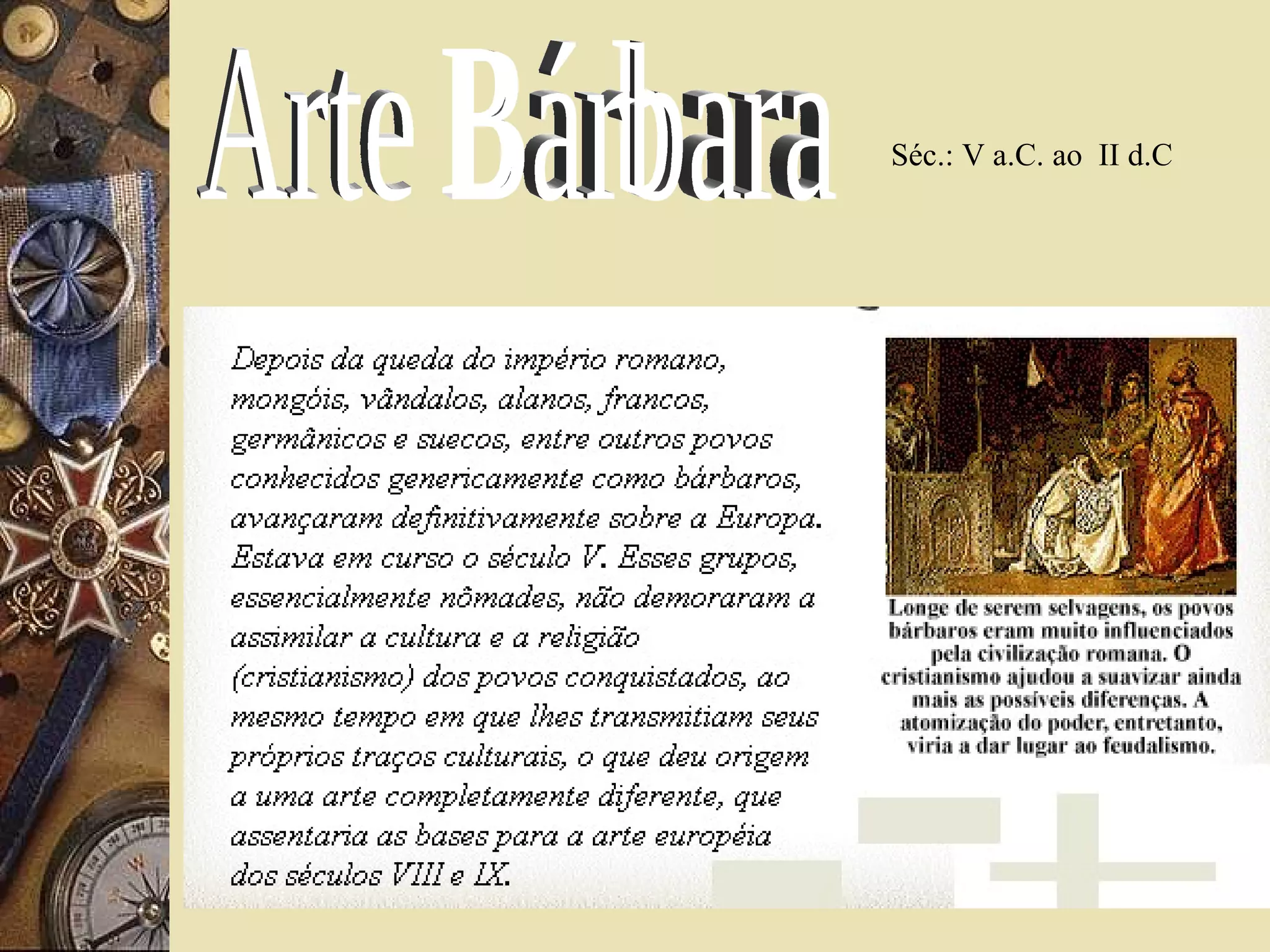 Arte Bárbara Nãopossuíam habitat fixo e isso influenciou em sua habilidades artísticas. Criavam e fabricavam objetos pequenos e facilmente transportáveis. Se sobressaíram no ourivesaria , na fundição e modelagem de metais: Armas Jóias