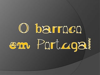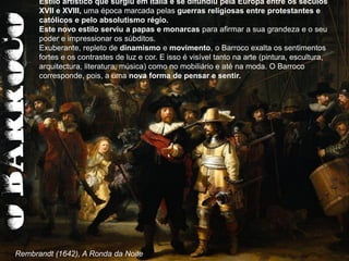 O documento descreve as principais características do estilo artístico Barroco na Europa entre os séculos XVII e XVIII, se destacando por formas dinâmicas e curvas, contrastes de luz e sombra, e emoções fortes. Também apresenta alguns dos principais artistas como Caravaggio, Rembrandt, Bernini e como o estilo se difundiu em Portugal no século XVIII sob o reinado de D. João V.