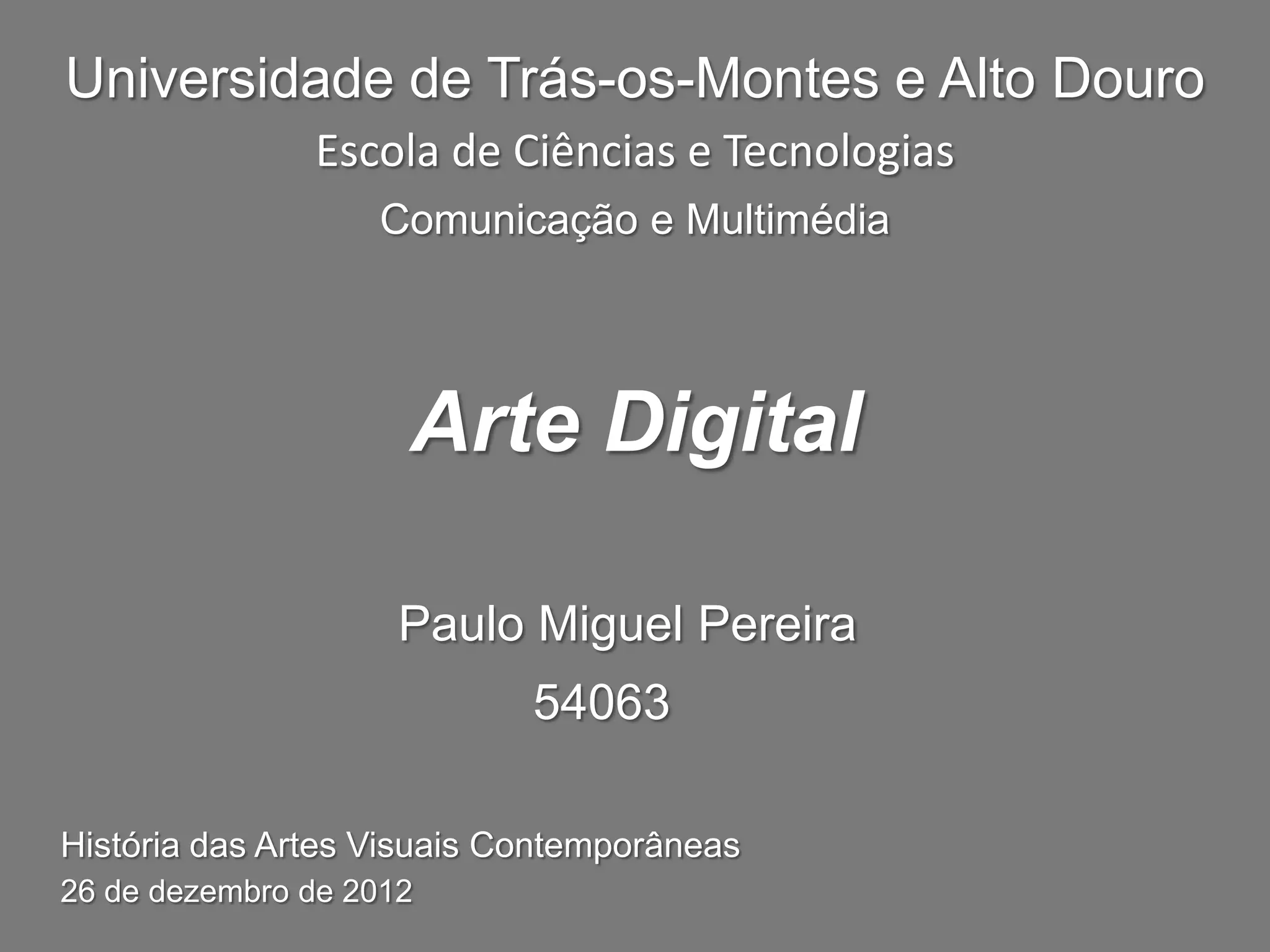 Este documento discute os vários tipos de arte digital, incluindo pintura digital, gravura digital, modelagem 3D, edição de fotos, animação, arte vetorial e arte pixel. A arte digital pode ser criada usando softwares pagos ou livres e é produzida totalmente em ambientes digitais. A arte digital oferece aos artistas novas formas de expressão criativa usando a tecnologia digital.