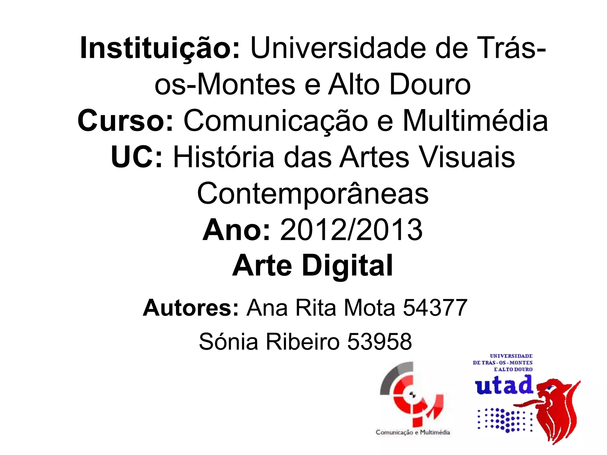 Este documento discute a arte digital, definindo-a como produzida com computadores usando processos digitais e virtuais. Ele categoriza diferentes tipes de arte digital como pintura digital, gravura digital, modelagem 3D, edição de fotos e animação. O documento também lista softwares comumente usados e fornece detalhes sobre o trabalho do artista digital Mário Cabrita Gil.