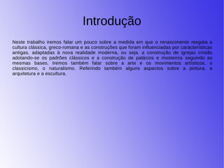 O documento aborda o Renascimento, destacando seu impacto na arte e na cultura clássica greco-romana entre os séculos XIII e XVII. Apresenta características do classicismo e do naturalismo, evidenciando como esses estilos influenciaram a pintura, arquitetura e escultura. A nova perspectiva do homem como a principal expressão do mundo e mudanças significativas na estética artística são ressaltadas.