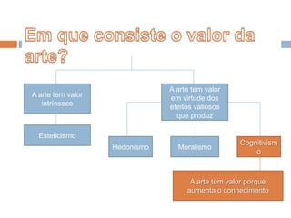 O documento discute a perspectiva filosófica do cognitivismo sobre o valor da arte. De acordo com o cognitivismo, a arte tem valor porque aumenta o conhecimento. O documento explora como a arte pode expandir a compreensão de acordo com Nelson Goodman e discute as principais objeções ao cognitivismo.