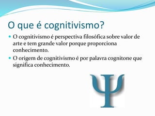 O cognitivismo defende que a arte tem valor por proporcionar conhecimento. Segundo Nelson Goodman, as artes não devem ser menosprezadas em relação às ciências como formas de descoberta e expansão do conhecimento. Uma das principais vantagens do cognitivismo é valorizar o conhecimento.