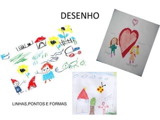 Este documento discute o desenho como forma de expressão de crianças em diferentes faixas etárias. No período de 6 a 9 anos, as crianças começam a dominar a linha e figuração básica no desenho. Entre 9 e 10 anos, muitas crianças tendem a desenhar personagens de desenhos animados da TV que sabem de cor.