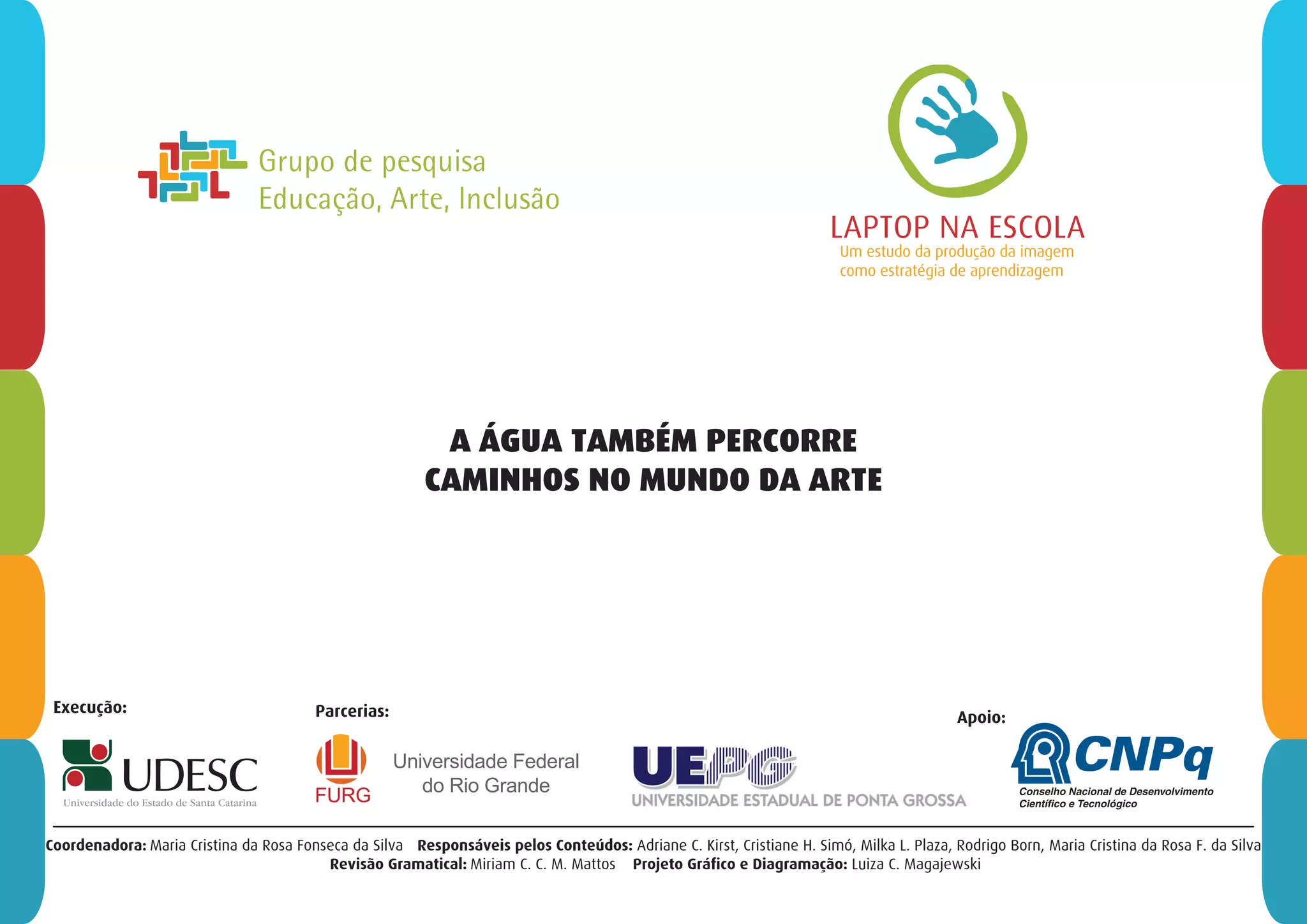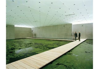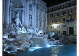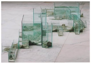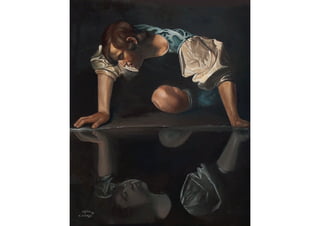 O documento apresenta 5 obras de arte que utilizam a água de alguma forma. A primeira é a pintura "Narciso" de Caravaggio que retrata a lenda grega de Narciso, um jovem que se apaixonou por sua própria imagem refletida na água. A segunda é a famosa Fontana di Trevi em Roma, projetada por Nicola Salvi. A terceira é a instalação "Discos Táteis" de Amélia Toledo que usa água colorida. A quarta é a instalação "The Mediated