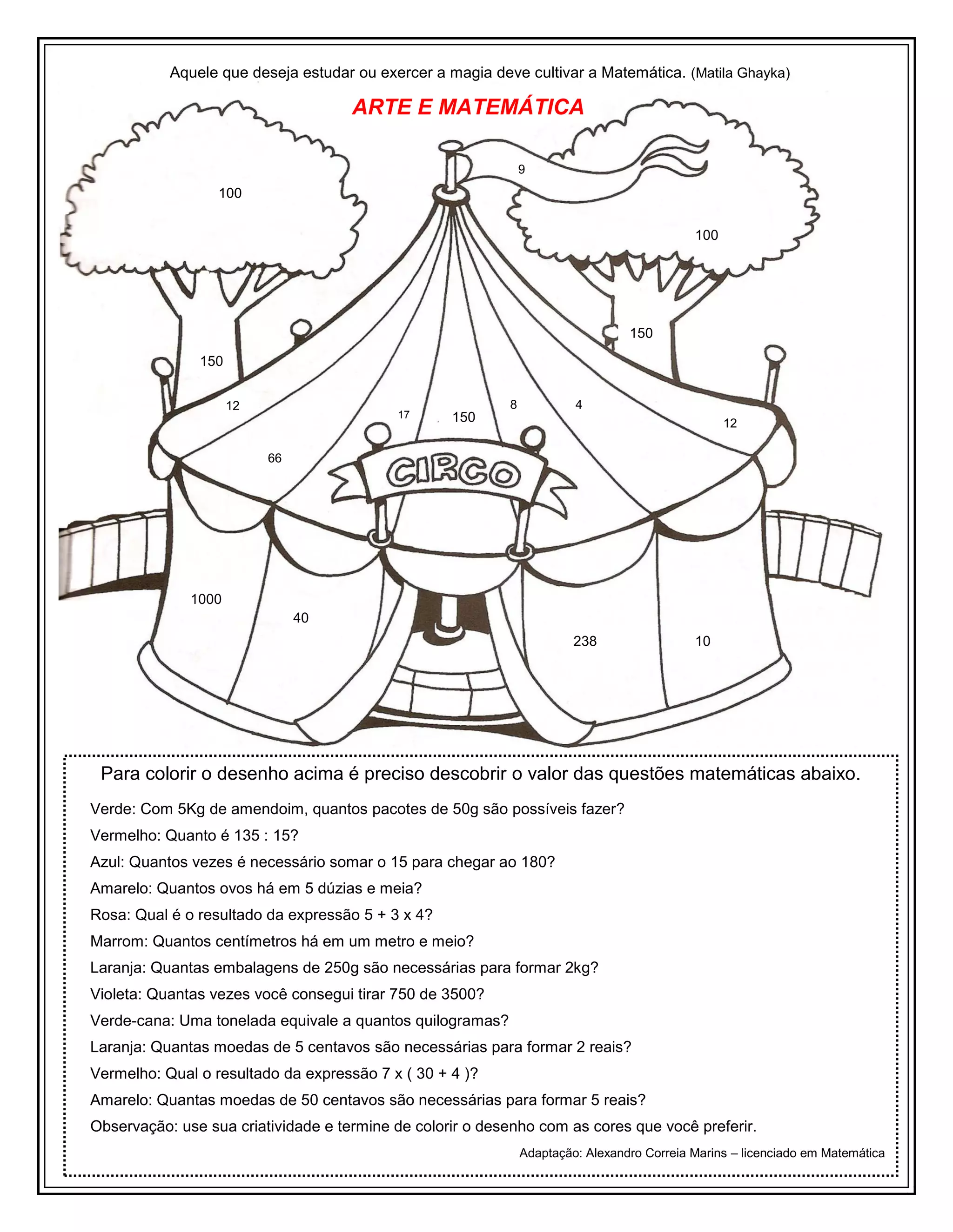 O documento discute a importância da matemática para o estudo e prática da magia. Ele fornece uma série de problemas matemáticos para colorir um desenho, cobrindo tópicos como frações, expressões, unidades de medida e conversões. A resolução desses problemas revelará as cores para pintar cada parte do desenho.