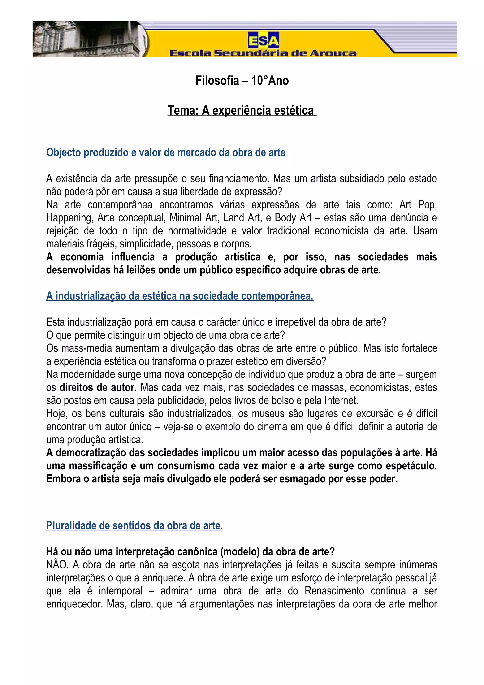 O documento discute como a arte é influenciada pela economia e sociedade, levando à industrialização e massificação da arte, questionando a autoria e experiência estética única. Também explora como a arte representa culturas, expande perspectivas e é essencial à humanidade.