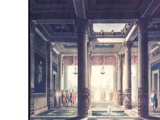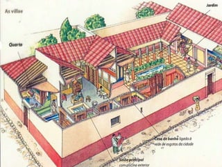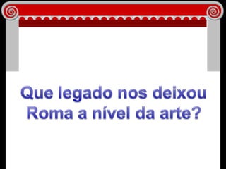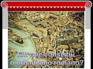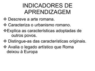 A arte romana foi profundamente influenciada pela arte grega, mas também desenvolveu características originais como a grandiosidade e o foco no utilitarismo. O urbanismo romano seguia um plano geométrico com fóruns, basílicas, termas, aquedutos e pontes, criando cidades bem planejadas. A arquitetura, escultura e artes decorativas romanas combinavam elementos gregos com inovações próprias.