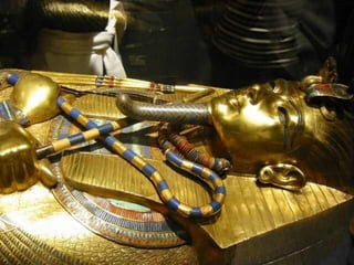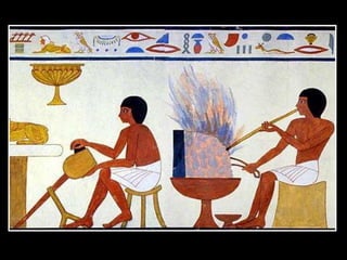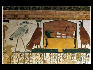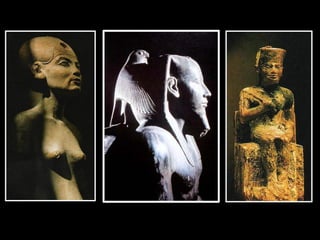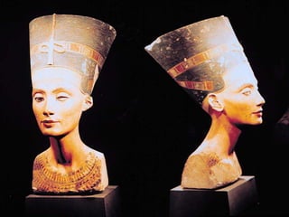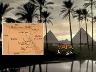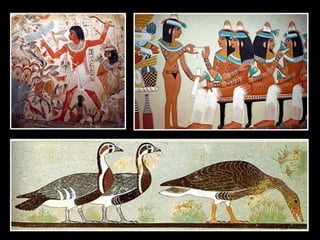O documento resume a arte da civilização egípcia antiga, que floresceu ao longo do Rio Nilo entre 5.000 a.C. e 30 a.C. A arte egípcia era principalmente religiosa e utilitária, e incluía pinturas hieráticas, arquitetura de templos e tumbas, esculturas de faraós e deuses, e objetos com hieróglifos. A pintura egípcia se caracterizava por cores planas e figuras frontais, enquanto a arquitetura produziu pirâmides, mastabas e