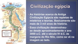 A civilização egípcia antiga se desenvolveu ao longo do Rio Nilo por mais de 3 mil anos. Sua história é dividida em três impérios que construíram mastabas, pirâmides e templos para homenagear os faraós e os deuses. A arte egípcia seguiu regras rígidas de representação e serviu propósitos religiosos e de exaltação real.