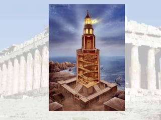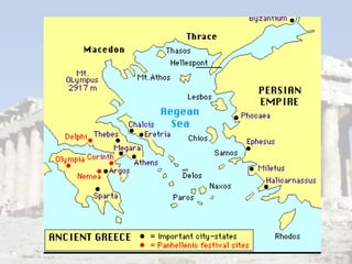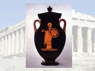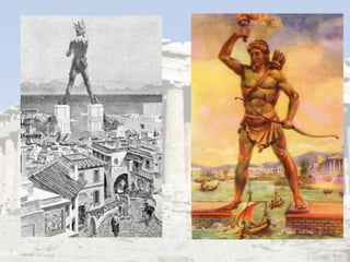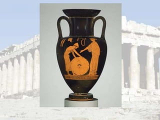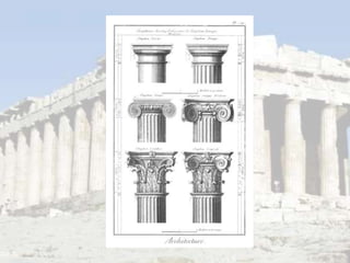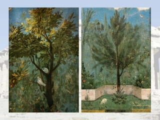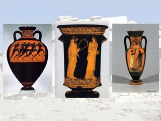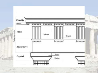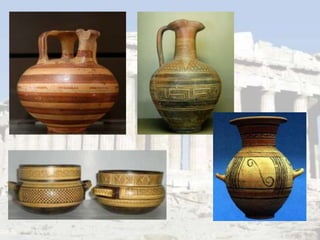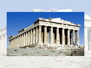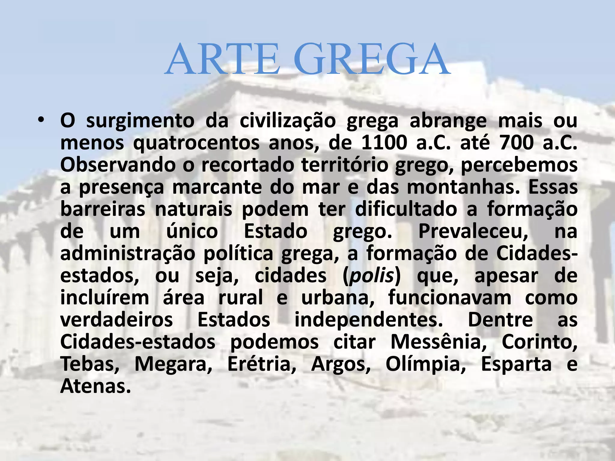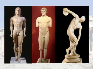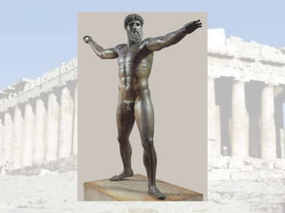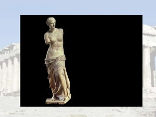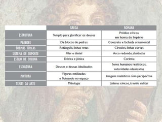 O documento descreve a arte grega e romana, dividindo-a em três períodos principais: Arcaico, Clássico e Helenístico para a arte grega, e abordando a pintura, escultura e arquitetura dos dois períodos. A arte romana desenvolveu-se a partir da influência grega, com foco na funcionalidade e realismo em detrimento do idealismo.
