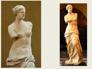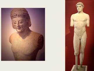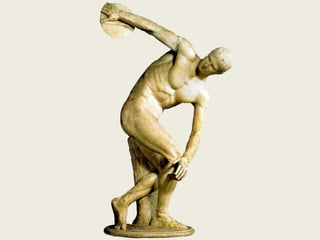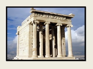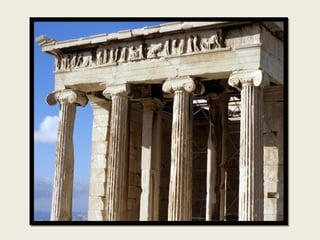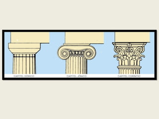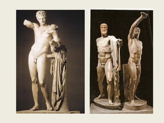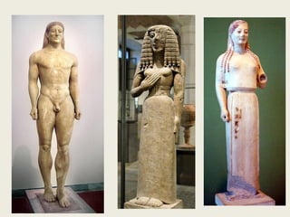 A arte grega antiga se destacou pela beleza de suas esculturas, pinturas e obras arquitetônicas, representando cenas do cotidiano e mitológicas. Dividida em períodos arcaico e clássico, a arte arcaica apresentou influência egípcia, enquanto a arte clássica buscou representar figuras em movimento. A arquitetura grega teve estilos dórico, jônico e coríntio.