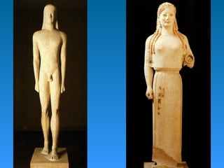 A arte grega passou por quatro períodos evolutivos: Geométrico, Arcaico, Clássico e Helenístico. Os gregos foram os primeiros realistas da história, representando a natureza de forma fiel. Nascente da escultura e pintura, a arte grega atingiu seu auge no período Clássico com obras que retratavam o corpo humano de forma naturalista e em movimento. No Helenístico, as esculturas passaram também a expressar emoções.