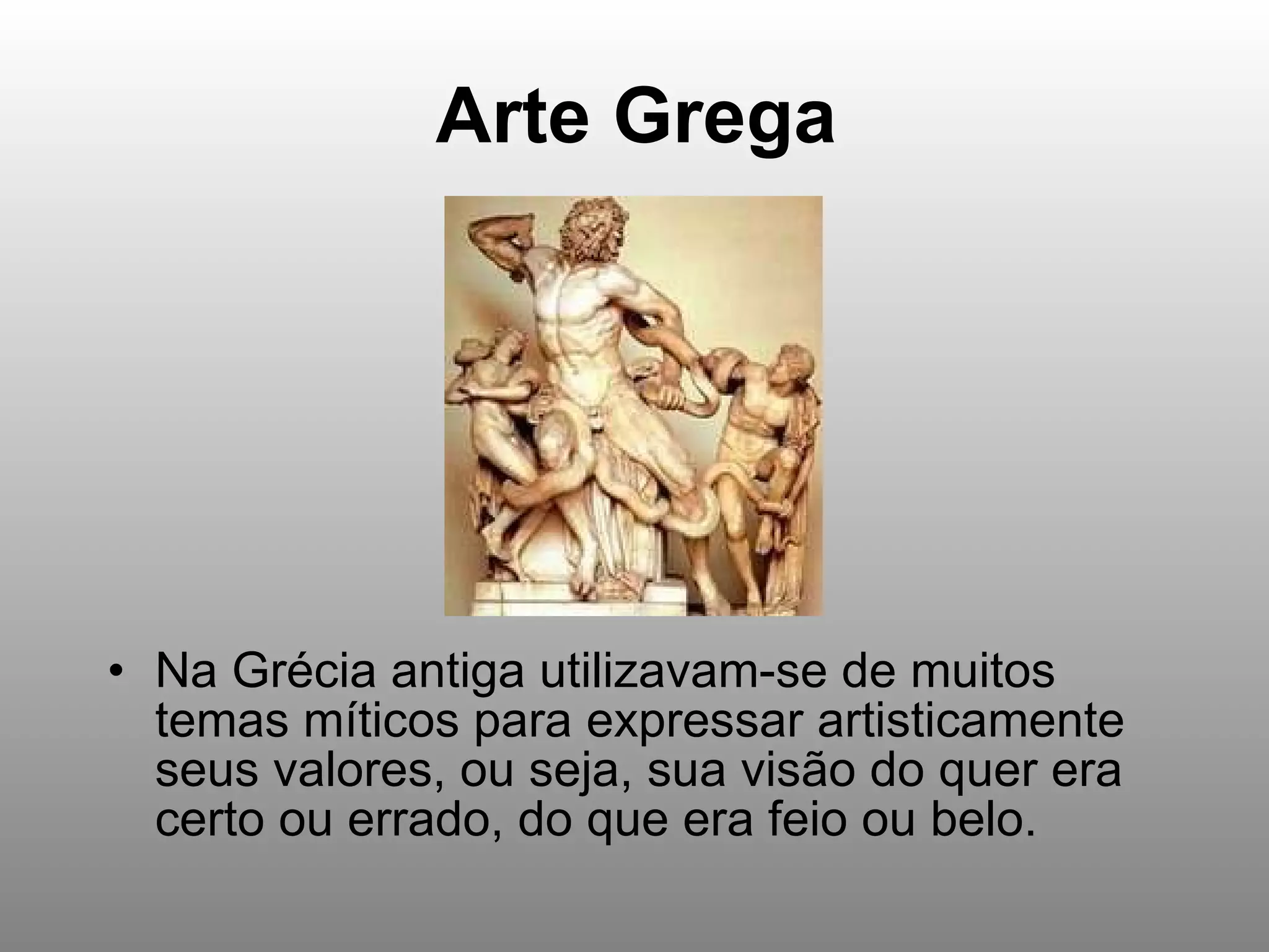 O documento descreve a arte grega, a pintura de vasos, a escultura e como o Renascimento surgiu na Itália no século 15, espalhando novas ideias e valorizando o ser humano. Também apresenta os principais artistas renascentistas como Leonardo da Vinci, Michelangelo, Rafael Sanzio e Sandro Botticelli.