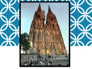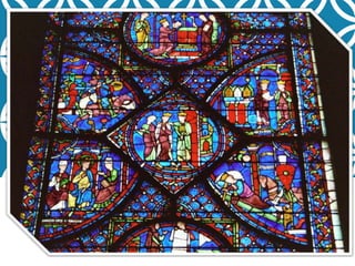 O documento descreve a arte gótica na Europa entre os séculos XII-XV, dividida em quatro períodos com mudanças nos arcos e decoração das catedrais, culminando na construção de grandes catedrais como Notre Dame. A pintura medieval era religiosa e hierárquica, enquanto vitrais e esculturas eram usados para educar o povo.
