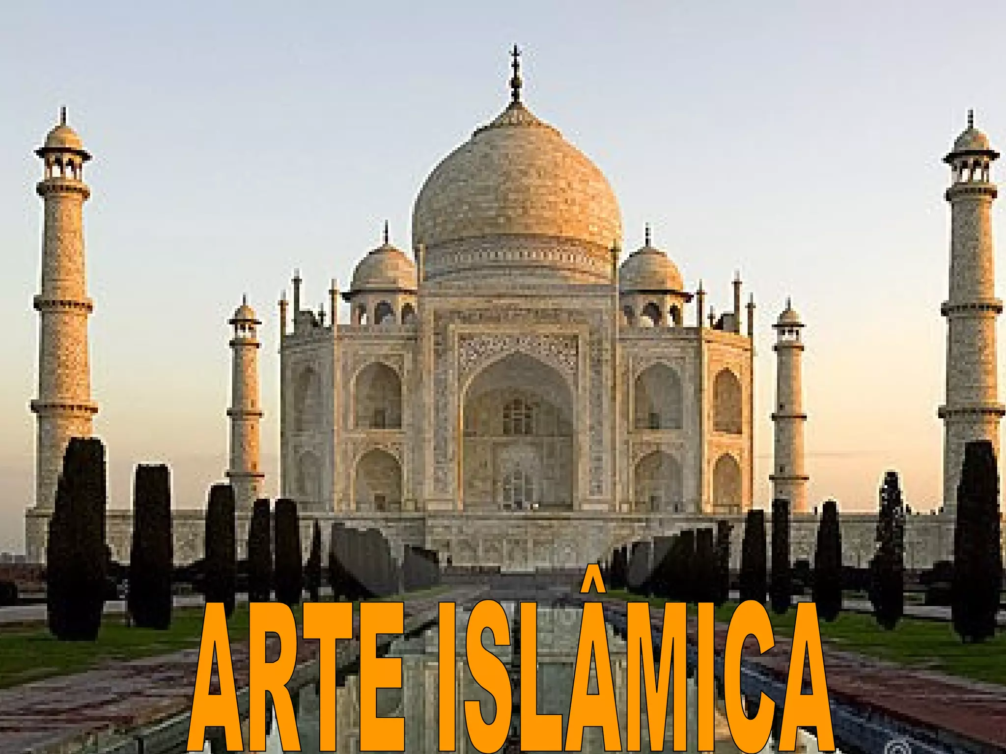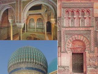 O documento descreve a expansão do Islã sob o Califado Omíada entre os séculos VII-X, quando o império Islâmico atingiu sua maior extensão. Destaca a arquitetura religiosa como a Mesquita de Damasco e a Cúpula do Rochedo, que revelaram os princípios da arte Islâmica como simplicidade e abstração. Também discute a proibição de imagens e a ênfase na caligrafia e decoração geométrica na arte e arquitetura Islâmica.