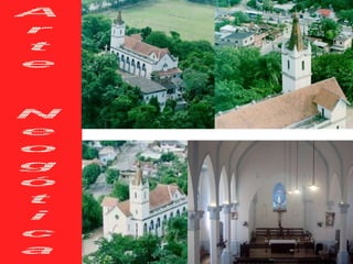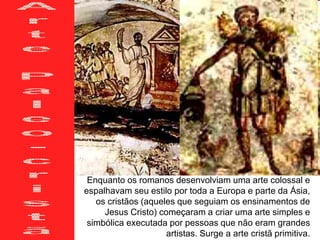 O documento descreve a arte cristã primitiva e como ela evoluiu ao longo dos séculos, desde as pinturas simbólicas nas catacumbas até o estilo bizantino e as grandes catedrais góticas. A arte sempre esteve ligada à Igreja e ilustrava temas e passagens bíblicas.