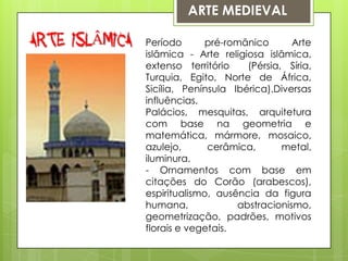 A arte bizantina estava intimamente ligada à religião, obedecendo a um clero fortalecido que controlava as artes e relegava os artistas a executores. A arte islâmica floresceu em palácios, mesquitas e outros edifícios com base na geometria e ausência de figuras humanas. A arte gótica incluiu catedrais com vitrais que davam maior luminosidade aos interiores.