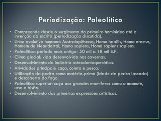 1) O documento discute a evolução humana desde os primeiros hominídeos até o período Paleolítico Superior, abordando as principais características de cada era.