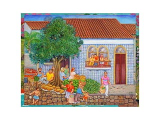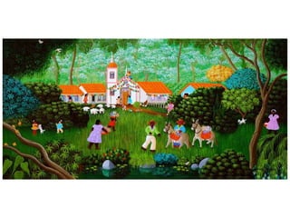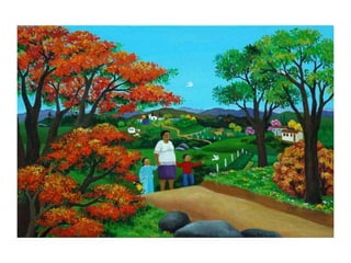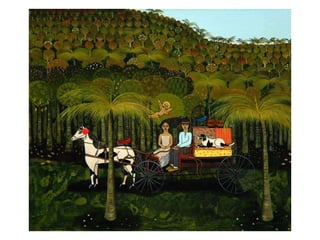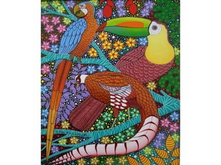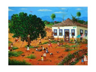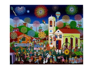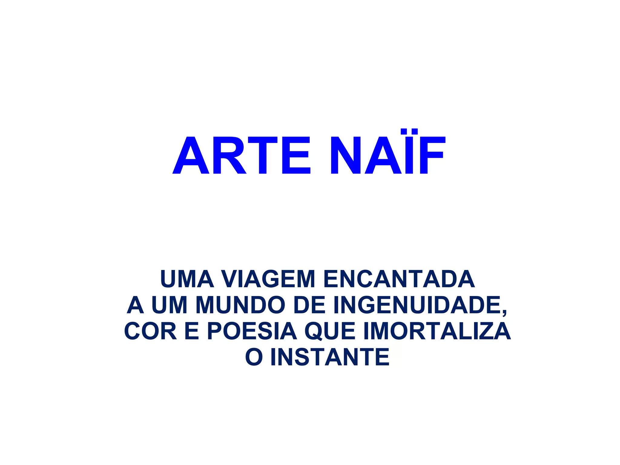 Este documento discute a arte naïf, descrevendo-a como uma viagem encantada a um mundo de ingenuidade, cor e poesia que imortaliza momentos. A arte naïf se alimenta da imaginação infantil e ultrapassa os limites do conhecimento, sendo capaz de expressar alegria, vivência, cor e luz de uma forma que a ciência não pode entender. O documento também discute a importância do trabalho do artista e como a arte serve para revelar a alma.