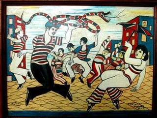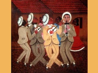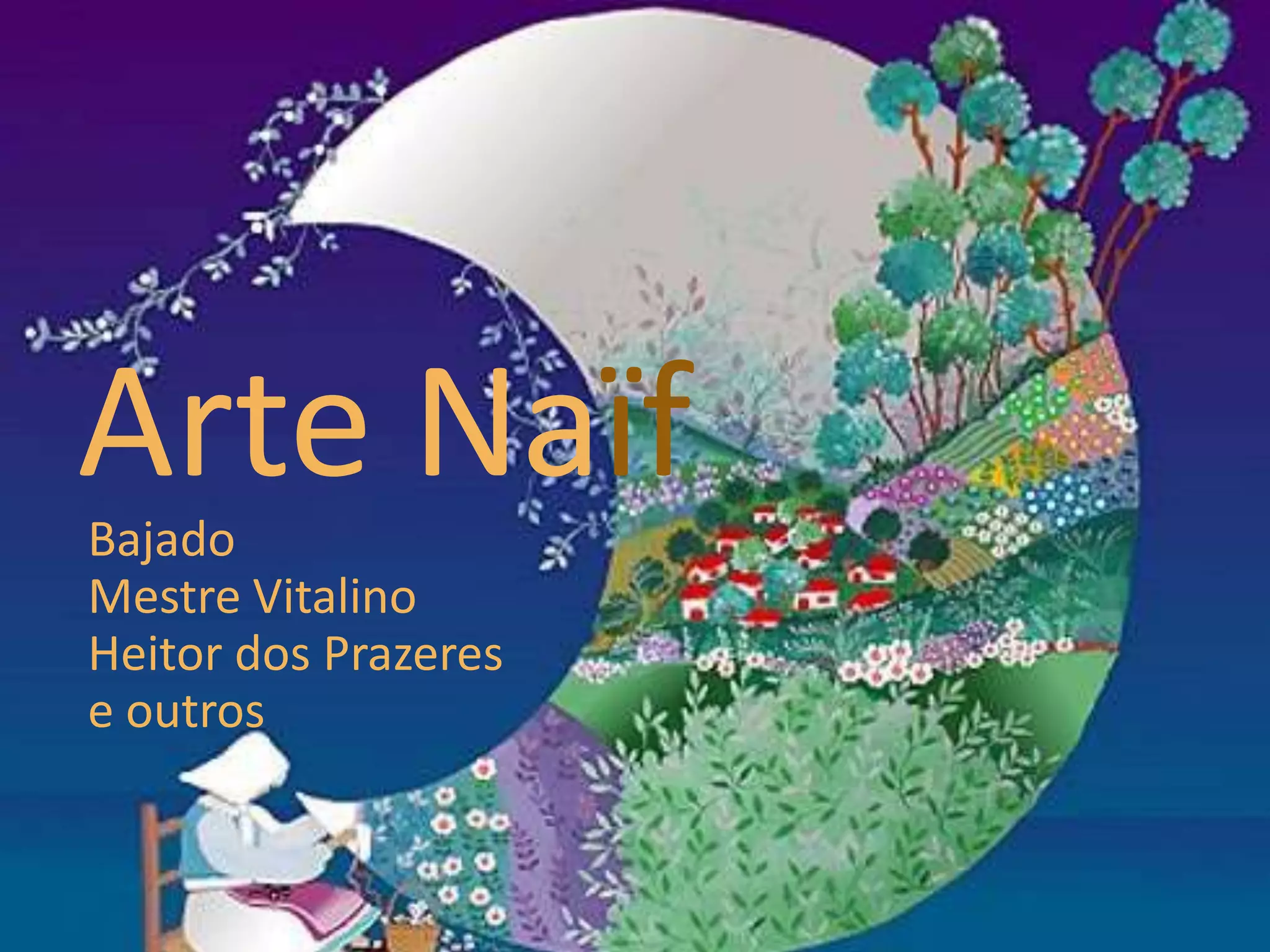 O documento discute a arte naïf, seu caráter autodidata e falta de formação acadêmica, resultando em aparente ingenuidade. Ele lista características como espontaneidade e artistas sem formação, e fornece exemplos de artistas brasileiros como Bajado e Mestre Vitalino e internacionais como Klee e Rousseau.