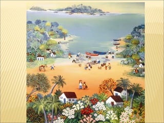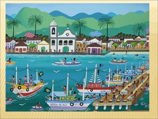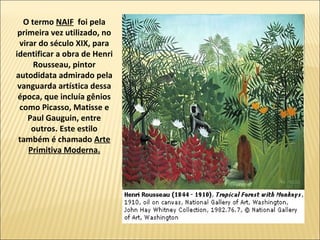 O documento discute a arte naïf, seu surgimento e características. A arte naïf surgiu no século XIX e foi inspirada pela obra de Henri Rousseau. Os artistas naïfs geralmente são autodidatas e pintam sem seguir regras acadêmicas. O Brasil é um dos principais países produtores de arte naïf no mundo.