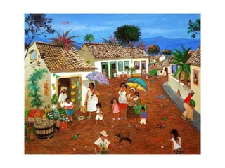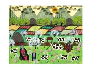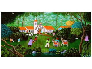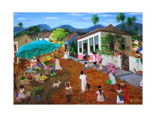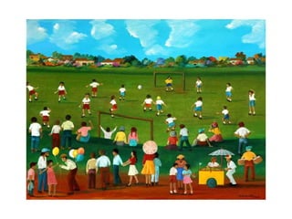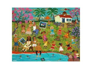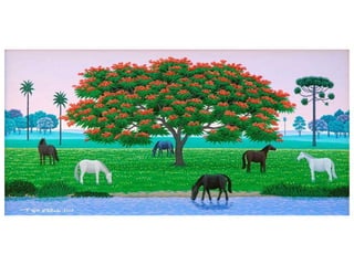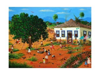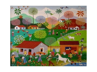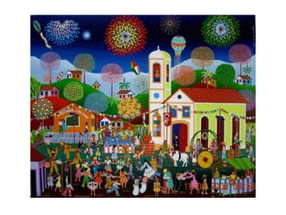 O documento descreve a arte naïf como uma viagem encantadora para um mundo de ingenuidade, cor e poesia que imortaliza o instante. Ele contém citações de vários artistas sobre a arte e sua relação com a criatividade, a poesia, a cor e a natureza. O documento também discute como a arte naïf se alimenta da imaginação infantil e como alguns artistas naïfs brasileiros, como Chico da Silva, receberam reconhecimento internacional.