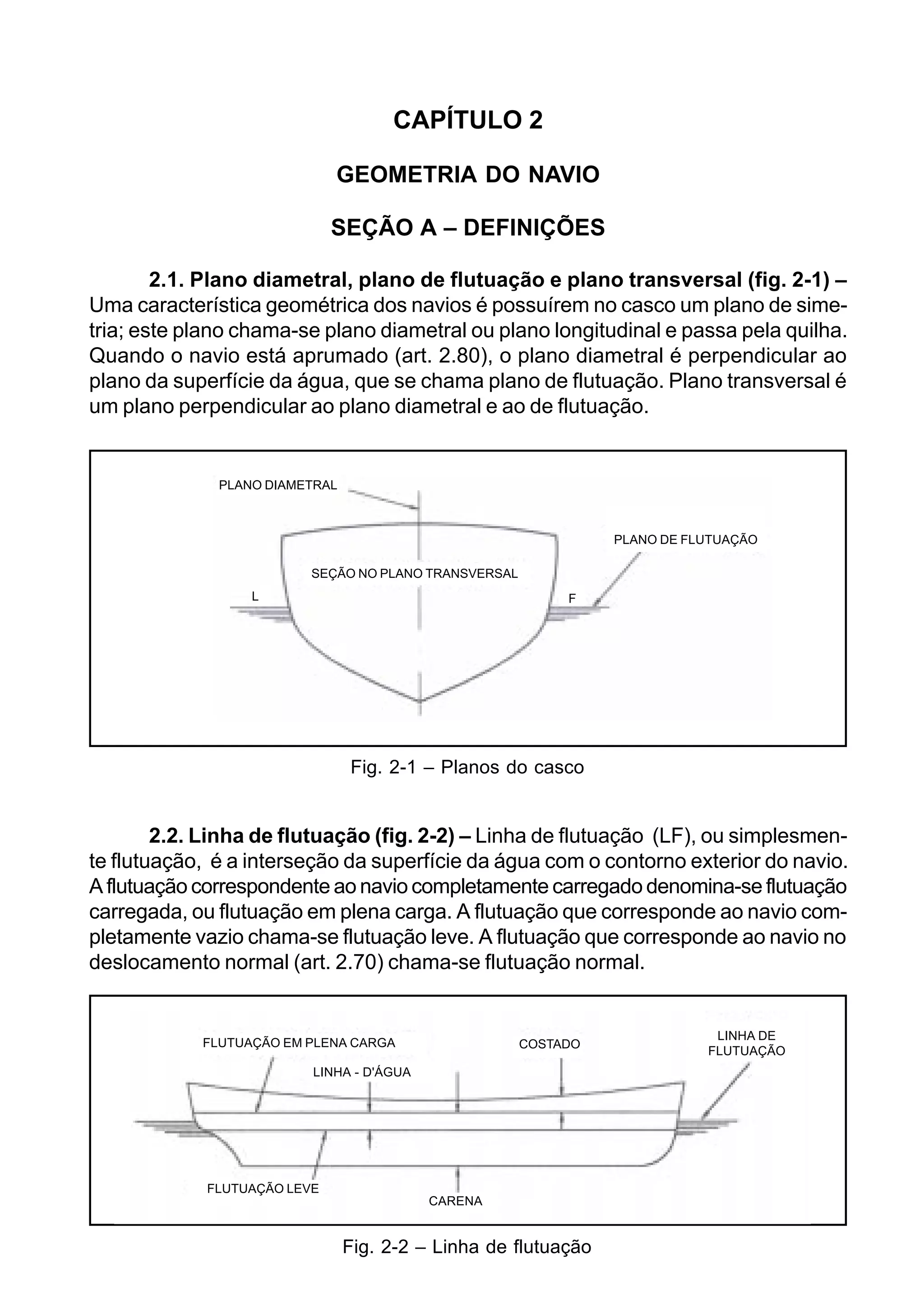 2) São definidos termos como plano diametral, linha de flutuação, flutuações direitas, volume da forma moldada e centro de gravidade.