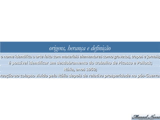 A arte povera surgiu na Itália na década de 1960 como uma reação ao colapso econômico do pós-guerra. Utilizava materiais simples como jornais, gravetos e trapos para criticar a sociedade de consumo e integrar arte e vida de forma espontânea e interativa com o público. Uma das principais figuras foi o artista Michelangelo Pistoletto.