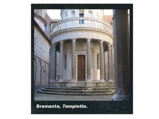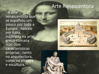 O documento descreve as características da arte renascentista na arquitetura, pintura e escultura. A arte renascentista se inspirou na arte greco-romana clássica, mas com elementos inovadores. Na arquitetura, utilizou arcos, colunas e frontões clássicos, além de abóbadas e cúpulas. Na pintura, destacou a perspectiva, composição equilibrada e naturalismo. Na escultura, valorizou o realismo e o nu.