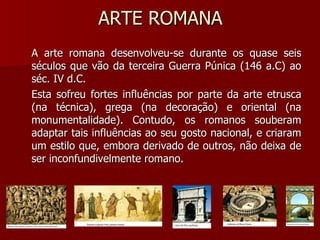 A arte romana desenvolveu-se entre os séculos III a.C. e IV d.C., sofrendo influências etrusca, grega e oriental, mas criando um estilo próprio. Na arquitetura, valorizaram o espaço interno e elementos como o arco e abóbada, construindo templos, basílicas, termas, teatros, anfiteatros e arcos do triunfo. Na pintura, destacaram-se paisagens e cenas triunfais, enquanto na escultura primaram pelo realismo nos retratos