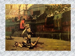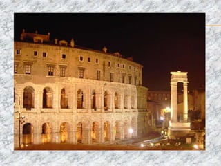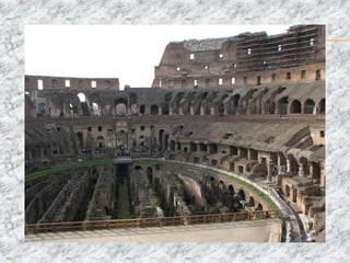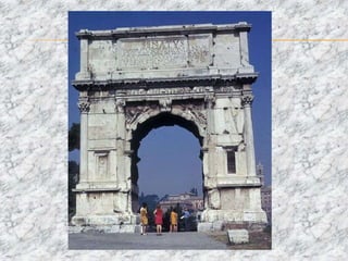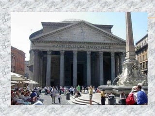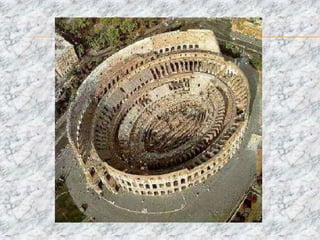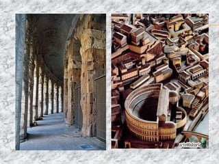 A arte romana foi influenciada pela arte etrusca e grega. Os romanos desenvolveram a arquitetura com o uso do arco e abóbada, criando grandes espaços como anfiteatros e termas. A pintura e escultura romanas derivaram da arte grega, enquanto a arquitetura buscava o funcional com obras como o Panteão e o Coliseu.