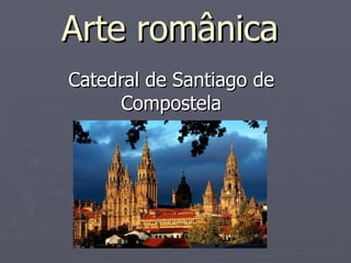 O documento descreve a Catedral de Santiago de Compostela, um importante centro de peregrinação cristã na Europa. Foi construída entre 1075-1128 durante a Reconquista Cristã na Galiza. Segue o estilo românico com planta em cruz latina e é ricamente decorada tanto externamente como internamente.