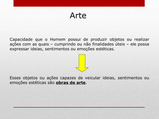 Este documento fornece uma introdução à arte, definindo-a como a capacidade humana de criar objetos ou realizar ações para expressar ideias, sentimentos ou emoções estéticas. Explora a evolução da arte desde as primeiras manifestações no Paleolítico até a Idade dos Metais, abrangendo estilos como a arte rupestre, o megalitismo e o desenvolvimento de novas técnicas.