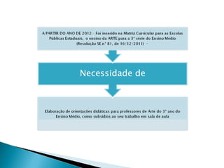 O documento discute a arte e tecnologia no ensino, propondo uma abordagem baseada em territórios da arte como linguagens artísticas, processo de criação e materialidade. Também apresenta diferentes bimestres focados em profissões artísticas e suas interfaces com tecnologias digitais.