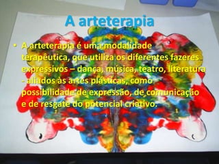 A arteterapia utiliza diferentes formas de arte como meio de expressão, comunicação e desenvolvimento do potencial criativo de um indivíduo. Seu objetivo é promover o crescimento pessoal através da expressão criativa, permitindo que pacientes expressem sentimentos de maneiras alternativas. A arteterapia busca estimular a autonomia e transformação interna para uma reestruturação saudável.